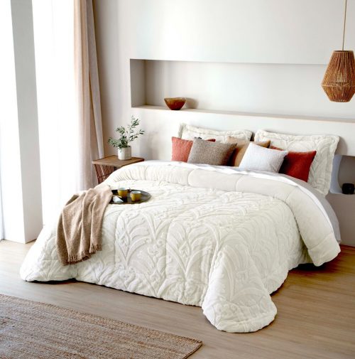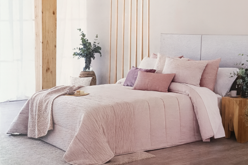 Colcha bouti modelo Azara de FunDeco en color nude. Medida 270×270 cm. Incluye 2 fundas de cojín 50×70 cm.