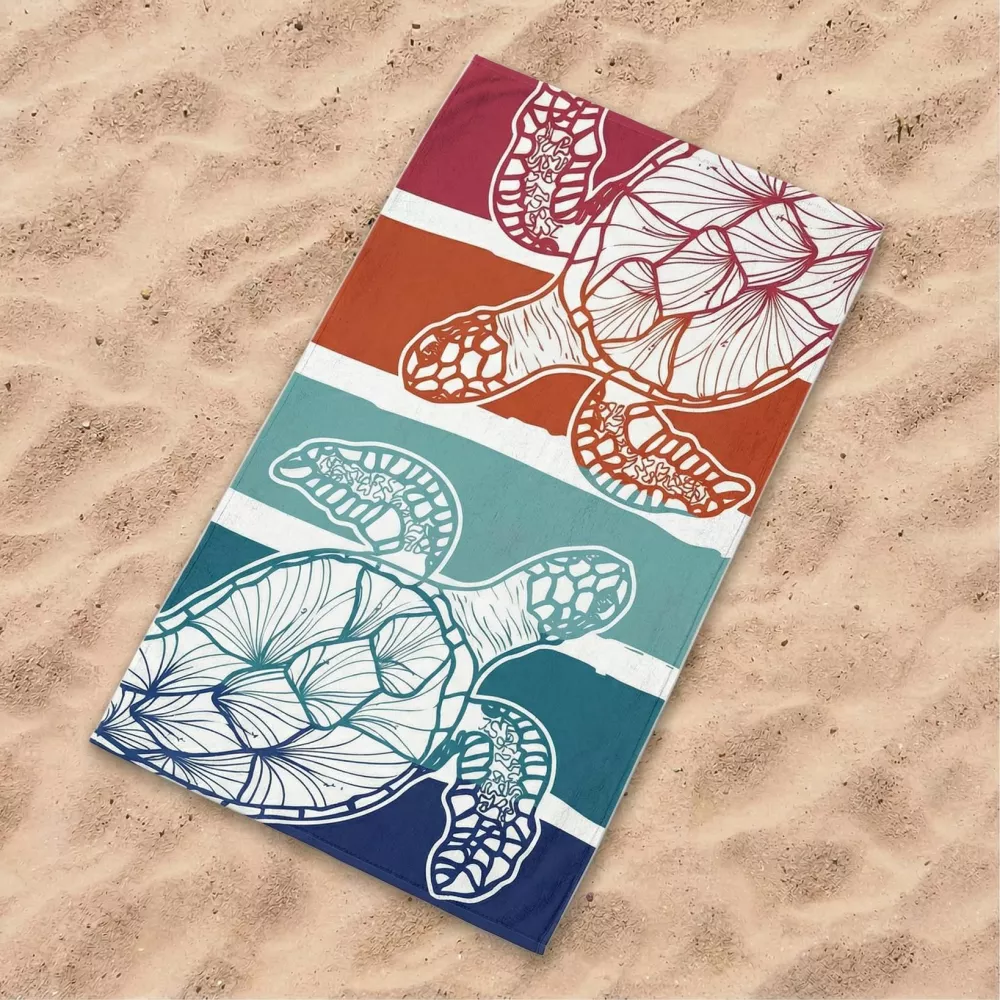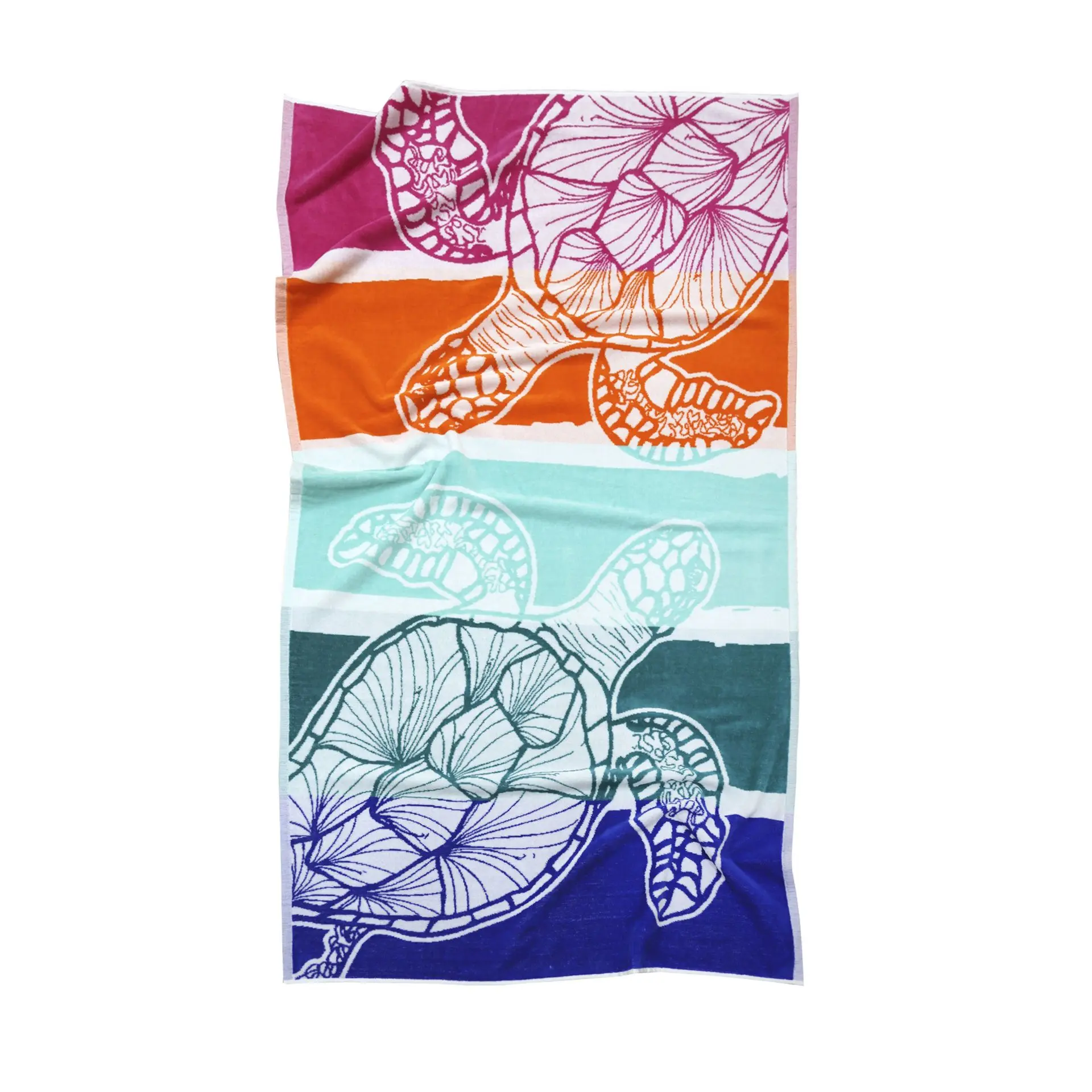 Toalla de terciopelo jacquard en modelo Tolay de Secaneta con un tamaño de 90cmX165cm, familiar, suave y absorbente. Muestra un patrón de unas tortugas sobre unos bloques de colores. Fabricada en 100% algodón egipcio.